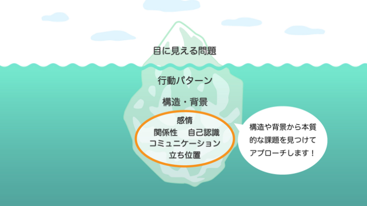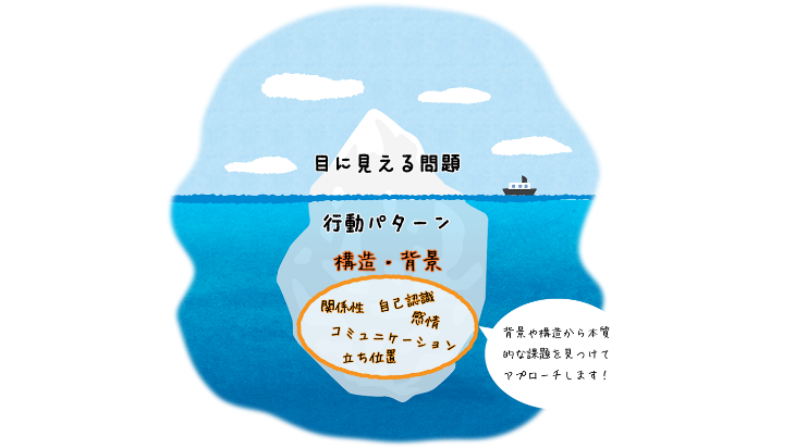 組織課題の本質アプローチについて、人事部門で認知されている氷山モデルをもとにイラスト化しました。